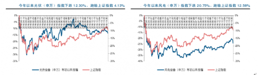 在行业基本面维持平稳的情况下,今年板块整体表现相对平淡,尤其是行业装机下滑的风电板块。截止 12 月初,光伏(申万)指数下跌 12.30%,跑输上证指数 4.13%;风电(申万)指数下跌 20.75%,跑输上证指数 12.58%。