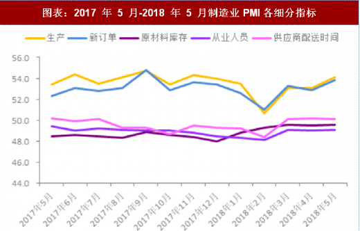 从各项细分指标来看,2017 年 5 月至 2018 年 5 月制造业的生产指数均位于 50 以上,其中 2018 年 3-4 月均位于 53.1,2018 年 5 月提升至 54.1,表明制造业生产保持较快扩张;新订单指数均位于 50 以上,其中 2018 年3-4 月均位于 53 左右,2018 年 5 月提升至 53.8,表明制造业市场需求继续 保持增长;原材料库存指数均低于 50,2018 年 3-5 月分别为 49.6、49.5、 49.6,表明制造业主要原材料库存量较为稳定;从业人员指数均低于 50,2018 年 4 月为 49.1、49、49.1,表明制造业企业用工量较为稳定;供应商配送时 间指数从 2018 年 1 月份 49.2 的提升至 5 月的 50.1,表明制造业原材料供 应商交货时间继续加快。