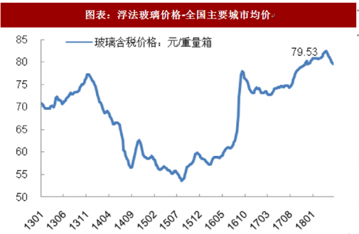 玻璃价格自 2016 年下半年起开始快速上涨,其含税价格由 60 元/重量 箱上涨至 78 元/重量箱,涨幅达 30%。17 年前三季度价格基本保持稳定, 四季度受益于环保趋严,河北沙河地区 9 条生产线被关停影响,需求较好带动价格持续走高。但 18 年春节后,行业整体库存压力较大,玻璃价格持续下跌,直到 5 月底才逐步见底回稳,当前玻璃价格 79.5 元/重量箱。