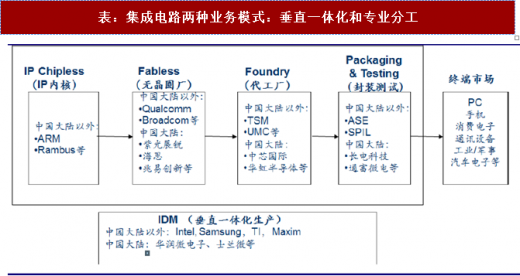 半导体行业经过70年的发展,目前主要有两种业务模式:垂直一体化模式(idm)和专业分工模式。其中,垂直一体化(idm)模式指的是企业集 ic 设计、制造、与封测等全过程于一体的全封闭商业模式。最早的产业巨头 intel 公司就属于 idm 模式。