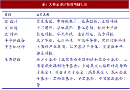 在制造领域,大基金投资了中芯国际、华虹集团、长江存储、士兰微等,在设计领域投资了紫光集团、中兴微电子、兆易创新、汇顶科技等,设备领域投资了北方华创、长川科技、中微半导体、沈阳拓荆科技有限公司等,封测领域投资了长电科技、华天科技、通富微电、晶方科技,材料领域投资了上海新昇、雅克科技、巨化股份等。此外,大基金还参股包括北京集成电路制造和装备子基金、上海集成电路制造子基金、上海集成电路设计与并购子基金(武岳峰基金)在内的地方基金,与深圳绩优团队社会资本一起设立鸿泰基金,同时还与大型龙头企业共同设立投资基金,如与京东方设立的芯动能基金、与中芯国际设立的中芯聚源基金、与三安光电设立的安芯基金等,尽最大程度撬动社会资本。