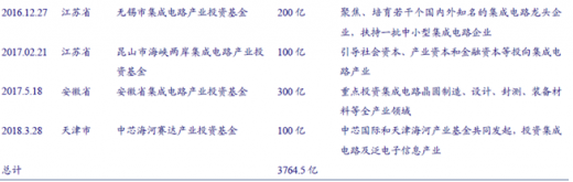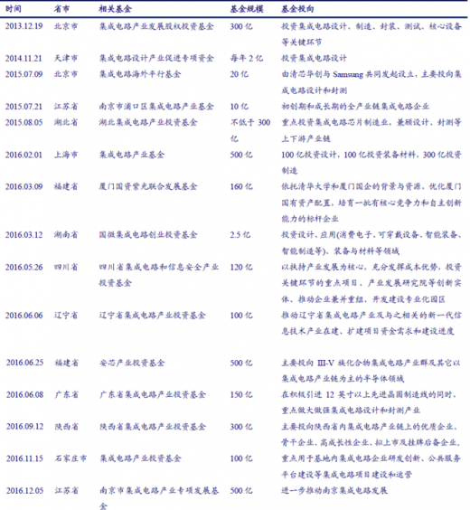 在国家集成电路产业投资基金之外,多个省市也相继成立或准备成立集成电路产业投资基金,目前包括北京、上海、广东等在内的十几个省市已成立专门扶植半导体产业发展的地方政府性基金。根据国家集成电路产业基金的统计,截止 2017 年 6 月,由“大基金”撬动的地方集成电路产业投资基金(包括筹建中)达 5145 亿元。