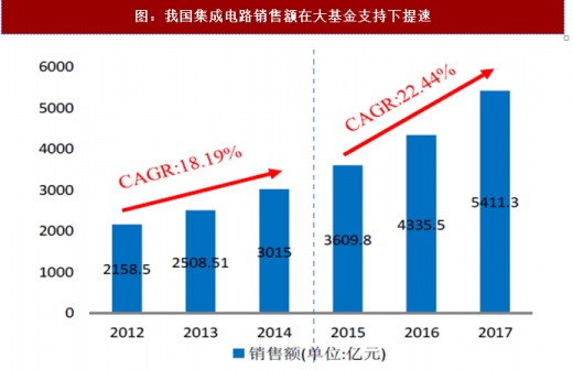 在一系列国家政策、大基金一期及各地社会资本的支持下,我国集成电路产业加速发展。根据数据计算,2012-2014 年我国集成电路销售额年复合增速为 18.19%,而在大基金成立后,2015-2017 年复合增速已达到 22.44%,增长了 4 个多百分点。