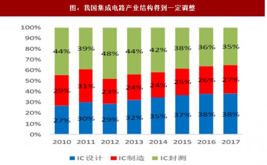 除了规模显著增长外,我国集成电路间的产业结构也得到一定调整,附加值较高的 ic 制造和设计环节销售额占集成电路产业总销售额比例稳步提高,2016 年,ic 设计环节首次超过封测环节,成为集成电路产业链占比重最大的环节。我国集成电路产业整体发展提速。