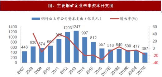 资本支出逐年下降,未来供给增量有限。据bloomberg数据,2013年之前,主要铜行业上市公司的资本支出逐年上涨,2013年之后则明显下降。鉴于矿业项目建设到投产一般需要3-5年,结合铜行业上市公司资本支出在2013年达到顶峰,由资本支出转化的铜矿供给产能预计2017-2018年达到高点。2018年之后铜矿产能扩张速度或将减缓,未来铜矿增量有限。