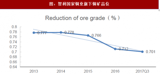 全球铜矿山品位持续下滑是导致铜矿供给产量下降的直接原因。全球矿山品位持续下滑,智利铜矿情况尤为突出。以智利铜业为例,该公司旗下的铜矿品位从2013年的0.77%下降至2017年q3的0.701%。目前全球铜矿面临矿龄过长问题,铜矿山品位的下降直接制约了全球铜矿供给的增加,吨金属铜的矿石处理量从2001-2016年增加46%,加大了控制采选成本的难度。