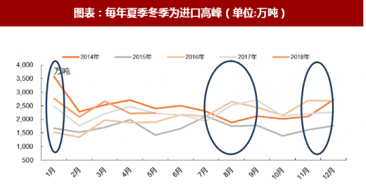 从进口的季节性来看,每年夏季和冬季是进口量最大的两个时段,增加用煤旺季的进口量成为缓解供应紧张的一种选择。2017 年底放开进口煤缓解冬季用煤压力;2018 年 3 月底 4 月初,煤炭供暖季后,逐步开始限制进口煤;6 月仹,随着迎峰度夏用煤高峰的到来,为更好保障国内用煤需求,煤炭进口将进一步放开,特刪对用煤予以完全保障。