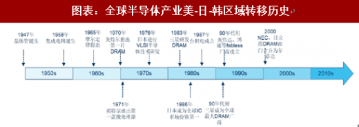 新一轮区域转移面向中国大陆。尽管目前 ic 设计、制造、封测的顶级厂商主要位于美国、中国台湾。总体来看,半导体制造产业经历了美国——日本——韩台的发展历程:1950s,半导体产业起源于美国,1947 年晶体管诞生,1958 年集成电路诞生。1970s,半导体制造由美国向日本转移。dram 是日韩产业发展的重要切入点,80s 日本已在半导体产业处于领先地位。1990s,以 dram 为契机,产业转向韩国三星、海力士等厂商;晶圆代工环节则转向台湾,台积电、联电等厂商崛起。2010s,智能手机、移动互联网爆发,物联网、大数据、云计算、人工智能等产业快速成长。人口红利,需求转移或将带动制造转移,可以预见中国大陆已然成为新一轮区域转移的目的地。