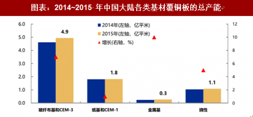 根据 2016 年《中国信息产业年鉴》数据(下图),2015 年中国大陆的玻纤布基材及 cem-3 总产能达到 4.9 亿平方米,纸基、金属基和挠性板的总产能分别为 1.8 亿、0.3 亿和 1.1 亿平方米(含半固化片),合计总产能达到 8.1 亿平方米。
