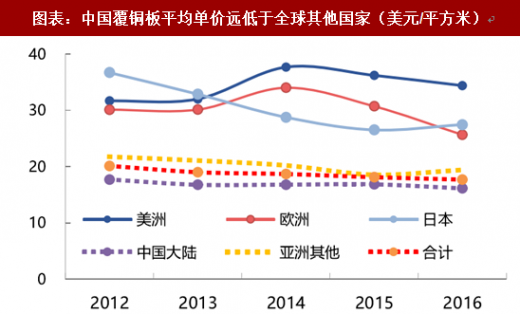因为传统覆铜板已经基本完成了从西方到我国的产业转移,我们以进口产品和出口产品来代表“高端”和“中低端”的覆铜板产品。根据海关总署统计的覆铜板进出口数据,从 2011 年开始,我国进口覆铜板产品与出口产品的价格差距逐步拉大,主要由于发达国家中低端覆铜板产能逐步向中国大陆转移,外资产品逐步走向高端化。同时,我们也可以从图中看到,在产能过剩、传统覆铜板价格周期性下滑的阶段,高端覆铜板基本不受影响,继续维持稳步上升的趋势。