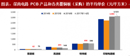 高端产品受原料周期影响较少,充分受益于下游应用的成长。一般各家覆铜板对特定客户的销售价格并不公开,我们引用国内 pcb 龙头深南电路招股说明书中的采购数据,发现成熟产品 fr-4 采购价格最低,每平方米价格不足百元,但经过聚苯醚树脂改性的 fr-4 价格高了一倍,而深南采购聚四氟乙烯(ptfe)和聚酰亚胺(pi)等特殊板材的平均价格高达 600 元/平方米。高端材料由于附加值高得多,原材料成本在收入中占比很小,受原材料价格周期性的影响可以忽略。同时,高端覆铜板对应下游均是处于高速发展期的成长型行业,对价格相对并不敏感。同时,下游市场规模的成长将首先由中高端覆铜板厂商分享,因此弹性也最大。