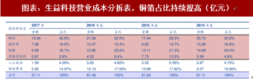 覆铜板行业的上游原材料主要包括铜箔、玻璃纤维布、树脂等。其中,铜箔成本占原材料成本较大比例。根据龙头企业生益科技的财报资料:从 2014 年~2017 年中 4 个报告期内,公司原材料成本中铜箔的占比分别为 33.9%、28.3%、32.0%和 42.9%,主要由于铜箔自 2016 年中后大幅涨价。截至2017年,公司铜箔、树脂和玻纤布在营业成本中占比为42.9%、19.0%、16.1%,人工成本 制造费用占比不到 20%。而公司近 3 年的毛利率的中枢在 15%上下,因此 fr-4 产品的业绩受原料周期影响较大。