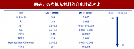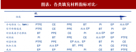 一般来说材料厂商的产品体系多按照来分类,通过树脂改性是主流的方法。目前应用最广、成本较低的为环氧树脂玻纤布覆铜板(fr-4),但 fr-4 的 dk 和 df 高达 4.2~4.8 以上,难以满足高频应用的需求。为了满足不同设备的特殊需求,各厂商目前已经发展出 ptfe(聚四氟乙烯)、ce(氰酸酯)、ppo(聚苯醚)、bt(双马来酰亚胺/三嗪树脂)等特殊树脂体系覆铜板,dk 可以低至 2.0 到 4.1 之间,由此衍生出的覆铜板种类超过 130 种。