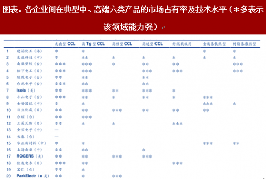 ptfe 由于优缺点都十分突出,因此每家企业都有独门配方对其进行改性,例如 ptfe 陶瓷填充。具有 ptfe 生产能力的包括日本(panasonic、hitachi chemical 等)、美国(罗杰斯、 isola) 的少数厂家,近年韩国(斗山)、台湾(联茂、台光电子、台耀等)厂商开始进入市场,逐步占有一席之地。2016 年,罗杰斯在 ptfe 领域的市占率已经超过 50%,其 ro3003 系列产品介电常数达到 3±0.04,介电损耗因子达到 0.001 水平,性能指标遥遥领先。在高频领域跟罗杰斯分庭抗礼的是美国 taconic,其微波天线 ptfe 标杆产品为 rf-10。另外,日立化成(hitachi chemical)lw-900g/910g 系列高频产品也占据一定市场份额。