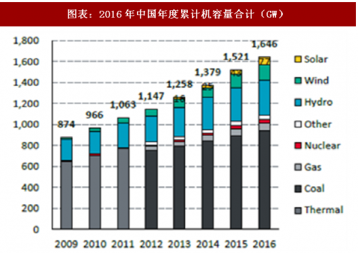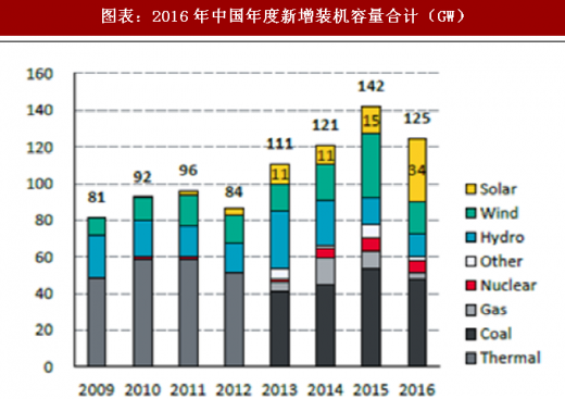 2016年,中国光伏新增装机34gw,占装机容量的5%,占累计装机的5%。