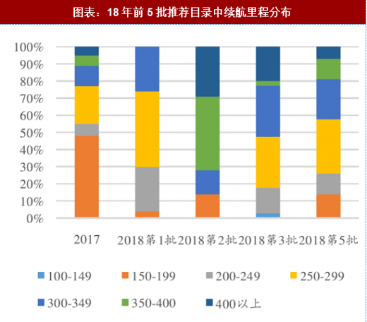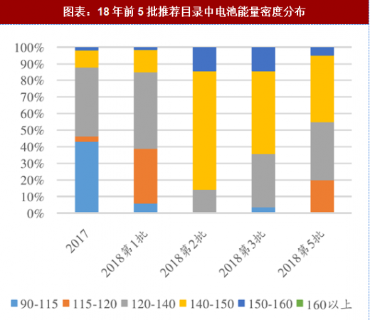 工信部公布的 5 批新能源汽车推荐目录,里面明显的变化就是高续航里程的和高能量密度的乘用车型大幅增加。续航里程在 300 公里乃至 400 公里以上的车型已经达到了数十款。电池系统的能量密度也已经从 2017 年的 120wh/kg 普遍提升至 140wh/kg 以上,但还没有 160wh/kg 的车型。在新版补贴中 160wh/kg 的车型补贴系数为 1.2,这也说明目前要达到 160 的能量密度还有一些难度,也更加凸显了提高能量密度的紧迫性。