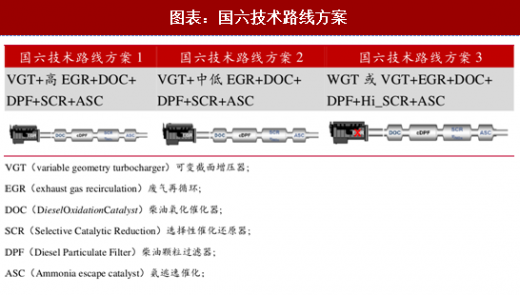 的排气污染物主要有 nox 和 pm。道路车辆国五排放阶段,nox 排放限值为 2.0g/kwh,pm 排放限值为 0.02g/kwh; 国六排放阶段 ,nox 排放限值为 0.4g/kwh,pm 排放限值为 0.01g/kwh。国六排放阶段由于排放限值更低,为了满足排放法规的要求,需要采用更多的技术配置和手段,因此结构更加复杂,目前主要技术路线有三条: