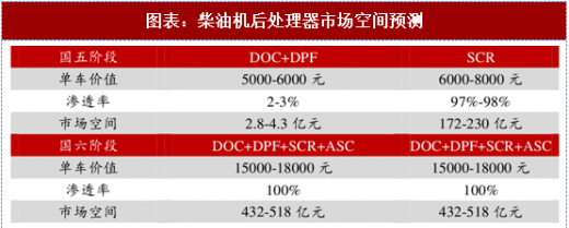 国六阶段后处理器系统单品价值将大幅提升,预计是国五阶段的 2-3 倍。dpf 将从无到有,拥有广阔的市场空间。我们对道路市场后处理器市场规模进行测算,预计在 2020 年国六排放法规实施后后处理器规模将迅速扩大一倍。