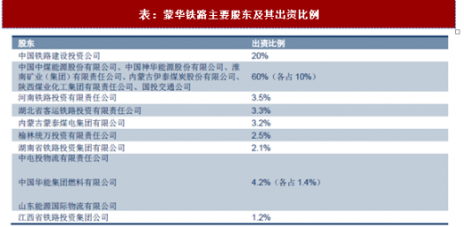 目前,国内在建的运煤专线主要为蒙华铁路,该与专线起于内蒙古自治区浩勒报吉站,经内蒙古自治区、陕西省、山西省、河南省、湖北省、湖南省,止于江西省吉安站,全长 1817 公里,规划设计输送能力为 2 亿吨/年。建成运营初期输送能力达到 1 亿吨,预计 2019 年年底通车,是国内规模最大的运煤专线。该铁路由蒙西华中铁路股份有限公司(简称蒙华公司)管辖,并有多家大型煤炭企业参股,参股煤企分布于内蒙古、山西、陕西、安徽等地区。总的来说,中铁投持股 20%,中煤能源等 15 家沿线地方企业持有剩余 80%的股份,其中内蒙古伊泰集团,内蒙古蒙泰煤电集团为参股企业中仅有的两家民营企业。