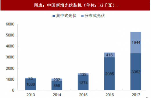 2017年中国的光伏发电装机实现快速增长,分布式光伏实现爆发式增长。2017年,全国光伏装机5306万千瓦,同比增长54%,占全部新增的40%。其中,集中式光伏装机增速减缓,同比增长11%,分布式光伏爆发式增长,新增装机达到1944万千瓦,同比增长3.7倍。
