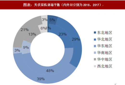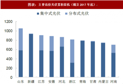 随着分布式光伏装机的爆发式增长,中国不同地区的光伏装机量逐步平衡。截止2017年底,山东超越新疆成为中国光伏装机量最大的省份,其中山东的分布式光伏装机占到全省总装机规模的44.8%。