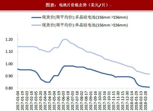 政策大力支持,光伏平价上网越来越近,光伏产品价格不断下降。根据wind的统计数据,光伏级多晶硅(现货价,周平均价,下同)自2018年年初以来已经下降了约16%。单晶硅片(156mm×156mm)自年初以来也下降了约11%。
