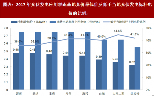 图表:2017年光伏发电应用领跑基地竞价最低价及低于当地光伏发电标杆电价的比例