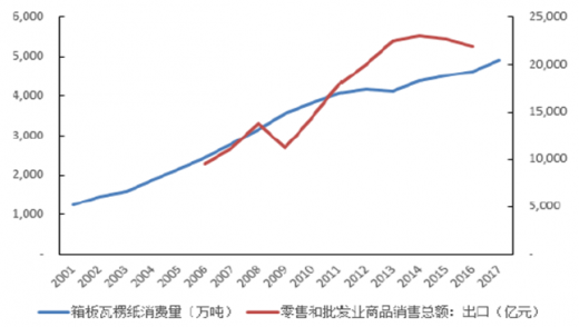 间接出口、零售和快递为箱板瓦楞纸的下游需求。其快递业务和零售的发展速度呈指数型增长,出口方面在2008年之前增长快速,2008年下降,2009年开始增速至2014年,2014年以后出口总额下滑。与此同时快递和社会零售的发展推动箱板瓦楞纸的增长,并形成一定支撑,箱板瓦楞纸消费量整体呈现平稳增长态势。