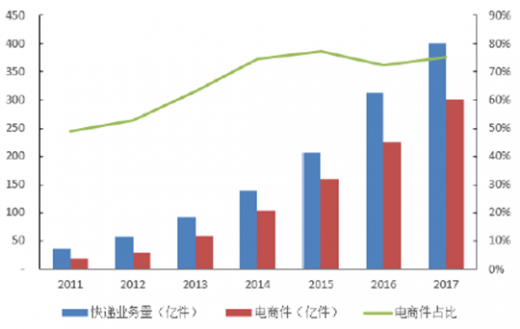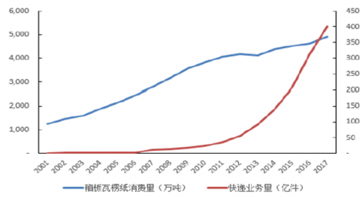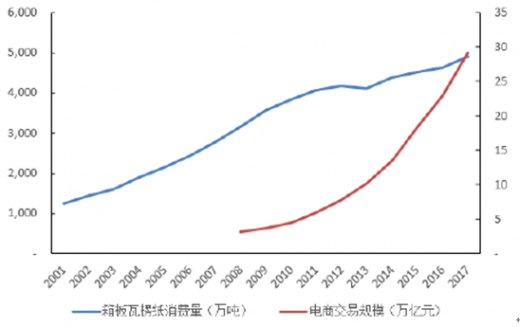 电商的发展带动了快递业务的迅速增长,箱板瓦楞纸也随着快递业务迅速发展。2008-2017年,我国电商交易规模cagr达到28.1%,电商的发展推动了电商件增加,也推动快递业务量整体增长,根据分析,电商快递件将不断推动箱板瓦楞纸的需求量的增加。