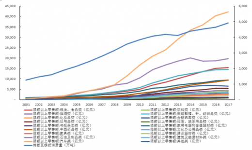 箱板瓦楞纸主要应用在食品饮料烟酒、化妆品、家电、电子等社会零售市场,其中食品饮料、化妆品等包装需求占多数。从限额以上社会零售额和箱板瓦楞纸消费量线性图看,箱板瓦楞纸消费量和各行业零售额走势具有相同性,金银珠宝类、石油制品类、书报杂志类和建筑装潢类与箱板瓦楞纸消费量走势具有差异性。而与箱板瓦楞纸需求基本无关的是石油制品类、书报杂志类和建筑装潢类。整体而言,社会零售中食品饮料、纺织服装、烟酒、日化的产品消费与箱板瓦楞纸消费量走势基本一样。