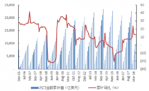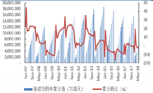 类、煤炭类、钢铁类、服装类、电话类、家具类、玩具类和家电类为我国出口的主要产品。其中与箱板瓦楞纸的间接出口量密切相关连的是服装类、电话类、家具类、玩具类和家电类。领更具数据显示,自2017年开始我国这五类产品的出口金额增速上涨,2018年以来平稳发展。