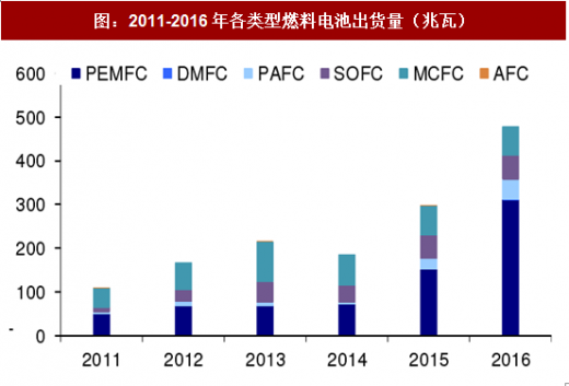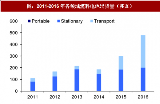 从目前三种燃料电池出货量比例来看,随着新能源汽车产业的迅速发展,交通运输领域燃料电池正占据越来越高的比例。据e4tech统计,2016年兆瓦出货量已经超过了固定式电源。