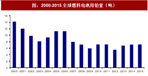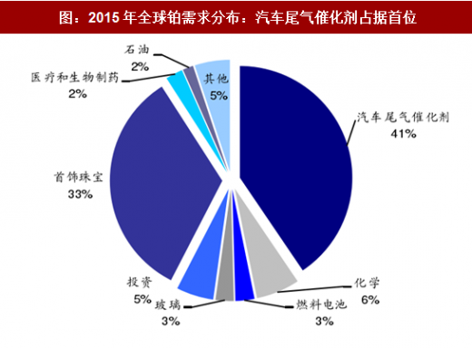 铂金属在的应用主要是作为催化剂。传统汽油、汽车尾气催化剂是铂一直以来最重要的工业应用之一,目前依然保持巨大的份额。据庄信万丰统计数据,汽车尾气催化剂需求在2015年达到106.7吨,同比增长5.85%,全球占比达到41%,是目前最大的下游需求领域。