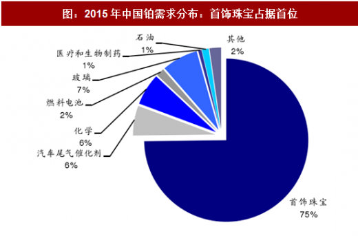 欧洲是目前全球铂族金属消费的主要地区之一,汽车尾气催化剂是欧洲铂族金属消费的主要领域,虽然近年来,欧洲汽车市场尤其是柴油车市场不景气,产量下滑,导致铂消费量下降。不过在中国,铂主要用于制作首饰,而在汽车领域铂金消费量一直处在较低水平,2015年首饰铂的消费量占我国铂消费总量的75%,而汽车尾气催化剂用铂仅占6%。