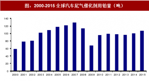 从用量趋势来看,由于尾气催化剂在汽车生产中不可或缺,因此用铂量跟汽车产量直接相关,所以又与经济周期呈一定相关性。全球汽车尾气催化剂用铂至2007 年峰值达到 128.9吨,是2000年两倍余。然后两年内急剧减少,2009年由于经济危机对汽车生产厂商的严重打击而跌入低谷。2010年进入平稳期,每年用铂保持在100吨左右。随着经济逐渐复苏,2013年开始用量见涨。可以预见未来几年内随着经济继续恢复,尤其作为全球最大的柴油车消费地区的欧洲,以及欧洲6b新标准的实施导致对尾气排放要求更严格,尾气催化剂用铂量将平稳增长。不过由于环境及能源问题,传统汽油、柴油汽车未来整体需求将面临危机。