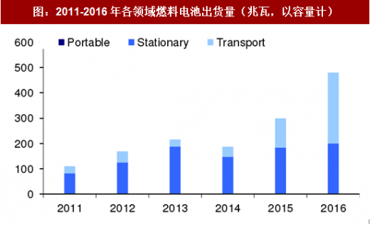 在出货量方面,以容量计,固定电池占比常年稳定在40%以上,产量情况基本随着整个燃料电池的情况波动。在2014-2016年,出货量件数呈现十分稳定的上升趋势。2014年以来,由于新能源持续成为市场热点,以兆瓦计的产量不断攀升,输运式电池迅速增长,相比之下,固定式电池有待迎头赶上,其在燃料电池出货量中的比重也一举从2013年的87%下降到了2016年的42%。