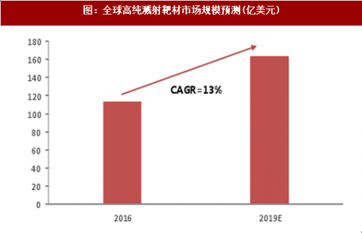 溅射技术作为薄膜材料制备的主流工艺,其应用领域广泛,如集成电路、平板显示器、太阳能电池、信息存储、工具改性、光学镀膜、电子器件、高档装饰用品等行业。高纯溅射靶材则主要用于对材料纯度、稳定性要求更高的领域,如集成电路、平板显示器、太阳能电池、记录谋体、智能玻璃等行业。20世纪90年代以来,随着消费类电子产品等终端应用市场的快速发展,溅射靶材的市场规模日益扩大,呈现高速增长的势头。根据中国电子材料行业协会数据统计,2016年全球溅射靶材市场容量达113.6亿美元,其中平板显示市场容量最大,达到38.1亿美元,市场容量占比33.54%,记录谋体则屈居第二,市场容量达到33.5亿美元,太阳能电池和半导体市场容量分别是23.4亿美元和11 .9亿美元。据预侧,到2019年,全球高纯溅射靶材市场规模将超过163亿美元,2016-2019年均复合增长率达13%。