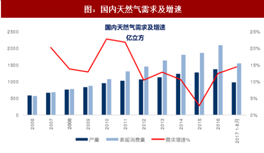 我国也在 2013 年成为世界第三大天然气消费国。 2017年1-8月份,中国天然气产量977.7亿立方米,同比增长9.2%;进口天然气4246 万吨,同比增长25.5%。随着冬季北方的供暖陆续开始,加之环保催生下游“煤改气”,天然气需求有望持续快速增长。