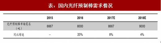 根据目前国内主要光棒生产企业的扩产情况,产能扩充低于年初市场预期;不考虑光纤出口情况下,2017年规划光棒产量国内市场自给缺口19%、2018年国内市场自给缺口2%;