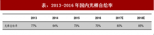 国内光棒自给率近几年维持在60%-70%,在中天科技、亨通光电、长飞光纤等主要光纤厂商扩张光棒产能后,按规划产能、乐观预计2017年光棒自给率能80%(实际产量看,扩产进度低于预期)。