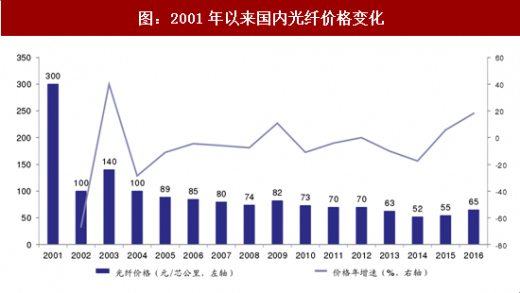 国内光纤供求持续紧张,光纤价格在2014年后进入上升通道。国内光棒产能供给制约,以及ftth、4g部署等大幅拉动光纤需求,从集采价格看,17年中国联通和中国电信将招标价格分别提升至62元/芯公里和60元/芯公里,而移动在最新的招标中未限价,但价格高位坚挺、供求紧张的局面持续存在。