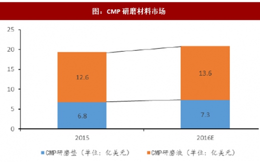 根据统计数据显示,2015年全球cmp研磨材料市场达到19.4亿美元,其中cmp研磨垫市场份额为6.8亿美元,cmp研磨液市场份额为12.6亿美元;预计2016年cmp研磨液市场将增长7.9%,达到13.6亿美元,cmp研磨垫市场将增长6.5%达到7.3亿美元,cmp研磨材料总体市场规模将增长7.7%达到20.9亿美元。
