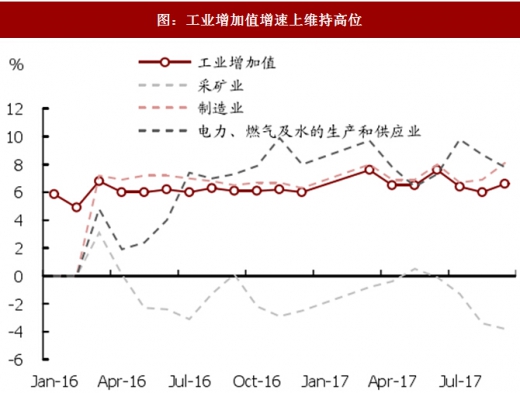 3季度国内实际柒油消费量继续保持正增长,与国内工业活动的大面积复苏相对应。2017年以来,柒油消费逐渐回暖,同比增速在2月份转正,3季度同比增速达到2.54%。2017年1~3季度中国实际柒油消费量增速达到1.0%,2016年柒油实际消费量则下滑3.9%。柒油消费的转正主要源于国内工业活动的持续回暖:从宏观经济数据上来看,3季度制造业工业增加值同比增速持续增加,并在9月份达到8.1%;从投资上看,3季度基础设施建设投资增速同比维持在14.3%的高位;房地产开发投资完成额同比增速达到7.4%。