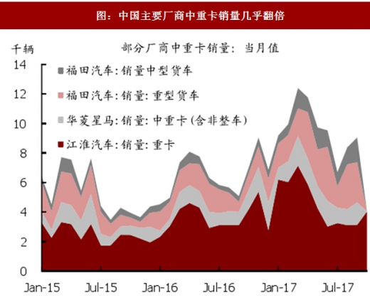 从下游消费来看,重卡方面,3季度,江淮汽车、华菱星马与福田汽车的重卡总销量同比增长45.6%,1~3季度同比增加56.0%。内燃机方面,3季度中国农用机械的内燃机销量同比增速达到9.2%,1~3季度同比增速达到16.8%。在销量增长的同时,利用小时数也持续实现同比增长。根据我们机械组跟踪的利用小时数据,汽车起重机、挖掘机利用小时数在9月份分别同比增长6%与14%,同样表现出下游的工程量依然旺盛。