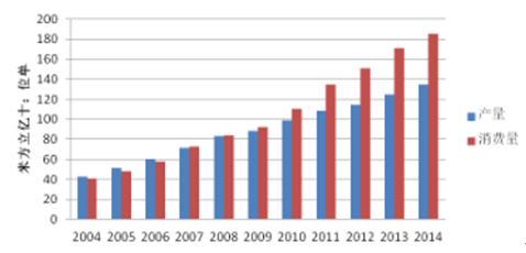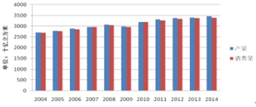 除 2009 年因全球危机导致天然气生产与消费量的下降外,近 10 年世界天然气产量和消费量总体呈逐年上升趋势。2014 年世界天然气生产量为 34,606亿立方米,消费量为 33,930 亿立方米。具体如下: