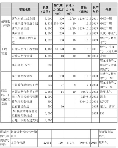 根据《天然气发展“十二五”规划》,“十二五”期间,新建天然气管道(含支线)4.4 万公里,新增干线管输能力约 1,500 亿立方米/年。我国“十二五”天然气管网重点建设项目情况如下: