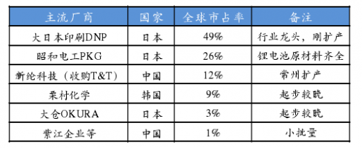 产业集中度高:由日本少数企业垄断,其中日本的dnp和昭和电工已经占据全球约75%的市场份额,另外日本t&t、韩国栗村化学的产能正在逐步释放。