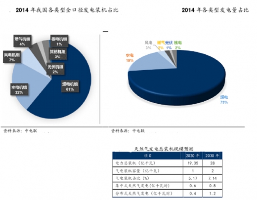 3)电力能源结构稳步升级,集中式天然气发电可承担新能源发电的关键调峰的角色。有效提高新能源发电比例是我国未来电力发展的趋势,2014 年我国风电、光伏装机容量分别为 0.952、0.272 亿千瓦,论装机容量已为世界第一和第二,占全国总装机容量比分别为 7%、2%。未来这个比例还将进一步上升,但新能源发电存在间歇性、波峰波谷起伏较大的特征,燃气机组启停快、发电效率高,能够对新能源发电灵活调峰,保证电网运行的安全和稳定性,扮演了促进新能源电力发展的关键角色。我们用新增燃气发电装机容量来衡量增量燃气发电项目的投产,在上述三个因素的推动下,“十三五”期间我国集中式燃气机组装机容量将稳步提升。