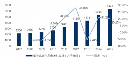 中电联 2012 年《电力工业“十二五”规划滚动总数研究报告》预测,2020 年我国集中式和分布式燃气发电总规模将到 1 亿千瓦时,其中集中式、分布式燃气机组装机容量各 5000 万千瓦时。但按照近几年累计集中式燃气发电装机规模来看,总装机容量增长幅度已超预期。2015 年集中式发电装机容量已达到 6371 万千瓦时,超过了中电联预测的 2020 年 5000 万千瓦的规模。但政策支持并没有进收紧迹象,《大气污染防治行动计划》、国务院《能源发展战略行动计划(2014-2020年)》、《十三五规划纲要》等都提及对集中式天然气发电的支持。虽然分布式是未来天然气发电的大趋势,但重点政策的持续发力以及现有条件下集中式天气发电仍在环保、调峰方面发挥着举足轻重的作用,使得集中式燃气机组新增装机容量还有很大的向上空间,我们预计 2020 年之前中电联预测的 2030 年装机容量达到 8000 万千瓦会被提前超预期完成!其后装机容量增速会趋缓,步入平稳缓慢发展期。