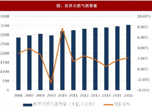 全世界天然气产量和消费量稳步增长,2016 年天然气产量达到3.55 万亿立方米,较2015 年增长3.20%,十年复合增长率2.11%。天然气消费量达到3.54 万亿立方米,同比增长1.80%,略低于天然气产量。2006 年至2016 年,除2009 年受金融危机影响外,产量和消费量增长率都为正。